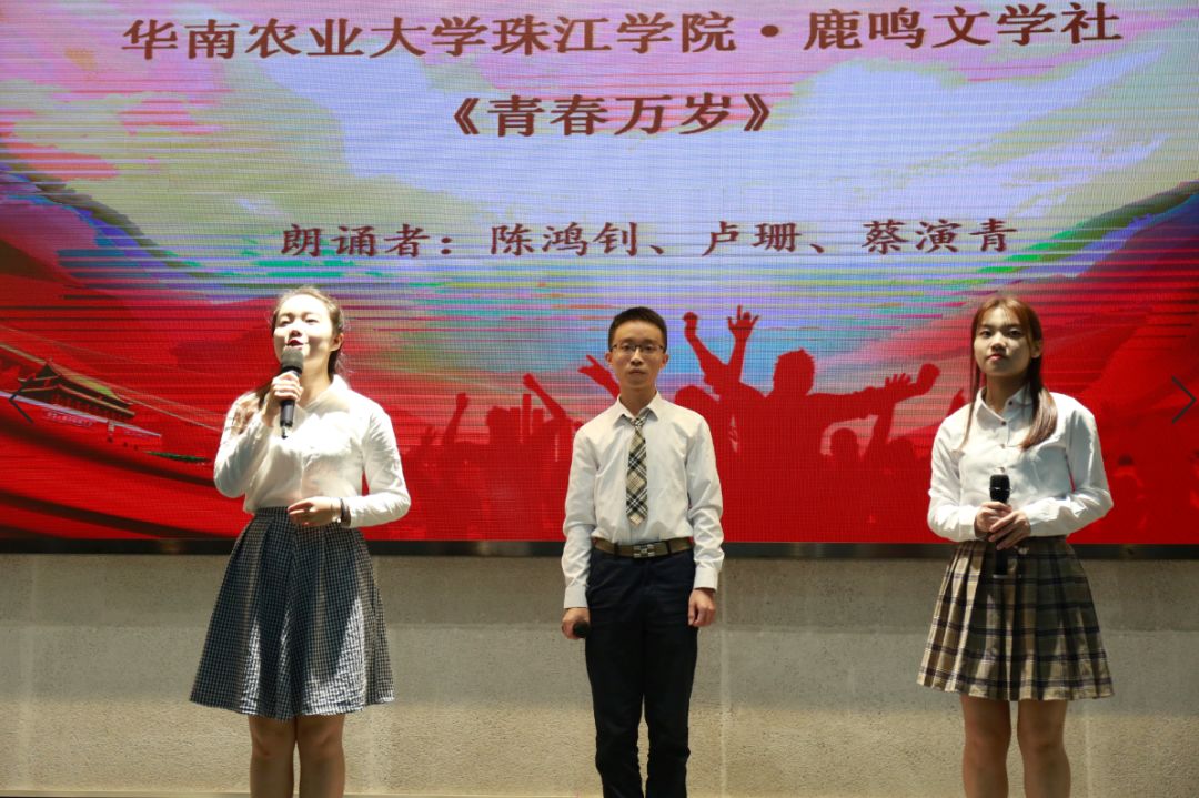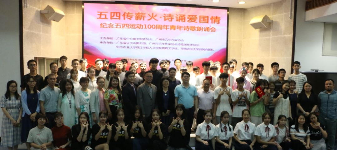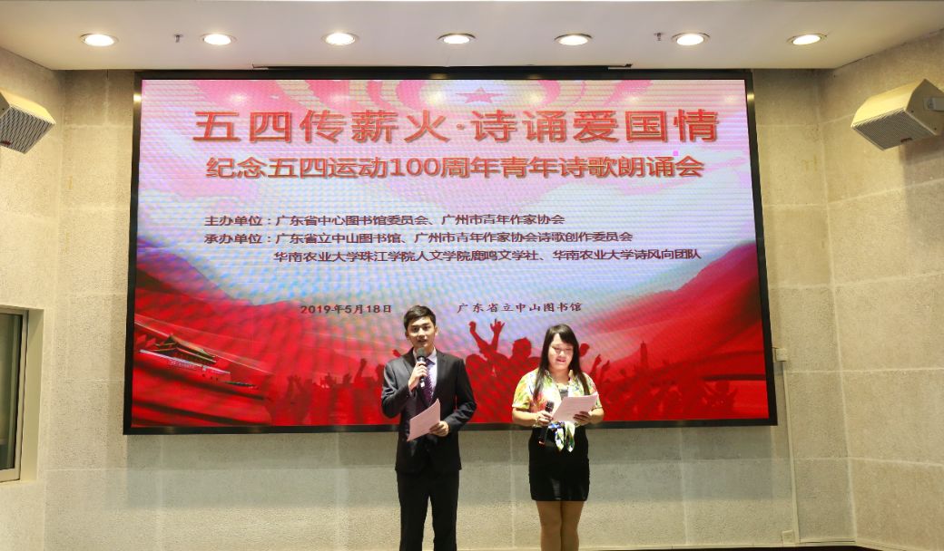 2019年5月18日,由广东省中心图书馆委员会、广州市青年作家协会共同主办,广东省立中山图书馆、广州市青年作家协会诗歌创作委员会、华南农业大学珠江学院人文学院鹿鸣文学社、华南农业大学诗风向团队联合承办的“五四传薪火·诗诵爱国情”——纪念五四运动100周年青年诗歌朗诵会活力举行。20余家高校社团、150多名作家文友和师生代表齐聚广东省立中山图书馆,共同纪念五四运动100周年,追念英勇先烈,感怀爱国深情。