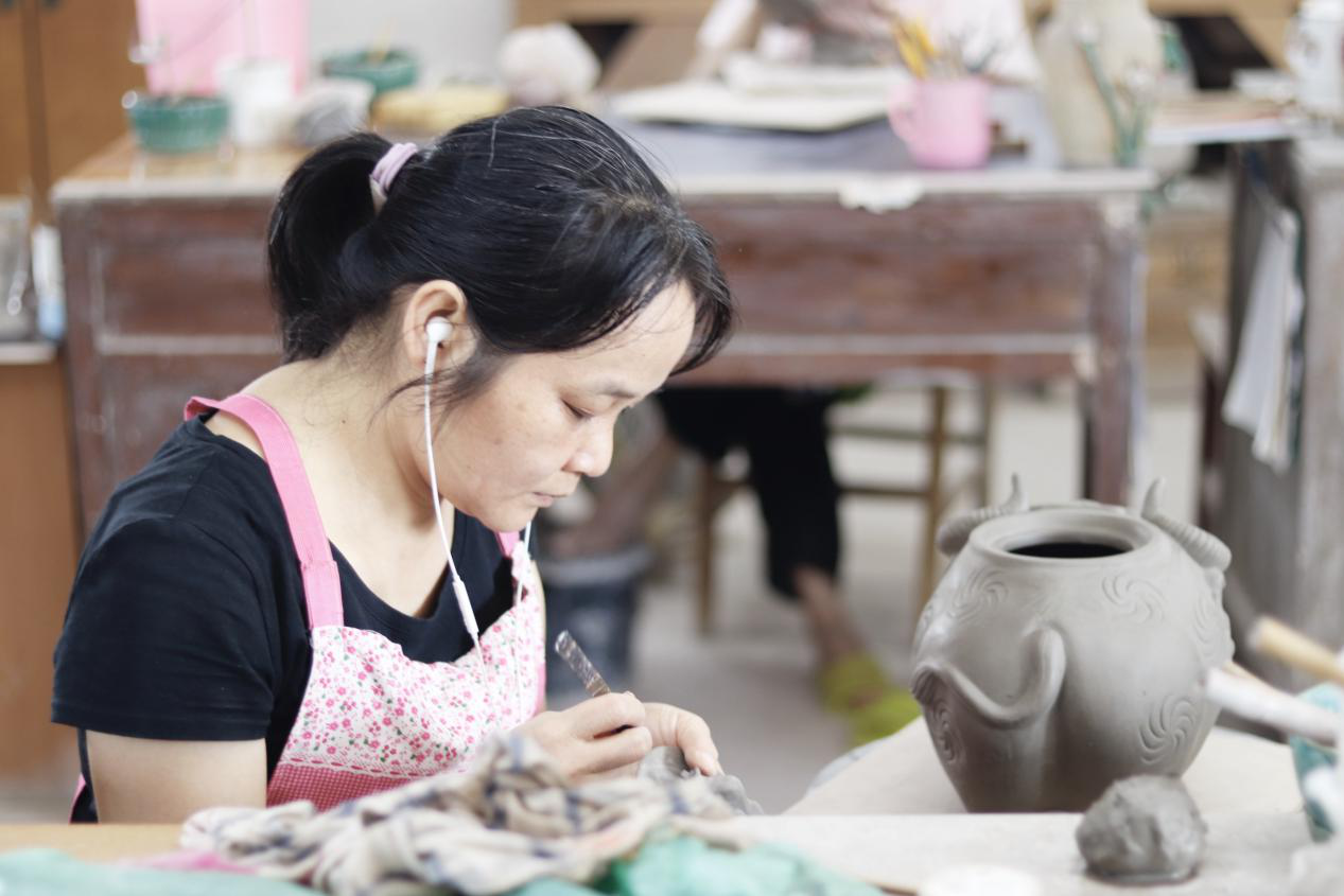 图为刘兆津老师陶艺馆旗下的陶塑手艺人在制作陶塑作品。
