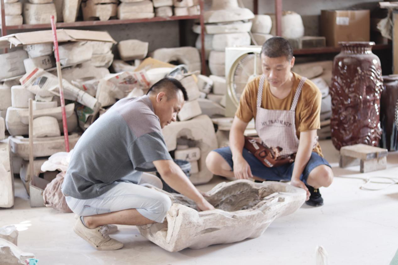 图为刘兆津老师陶艺馆旗下的陶塑手艺人在清理制作陶塑作品的加模具。