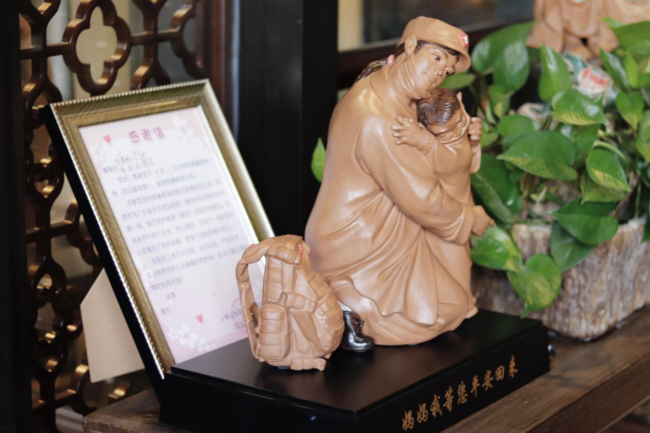 图为老师的根据抗疫为主题的陶塑作品《妈妈我等您平安回来》。