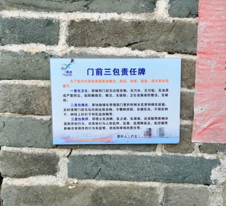 这是关于村民家门前的三包责任牌,每家都需承诺:承包好自家门前的卫生、绿化、秩序。