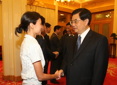 6月14日,党和国家领导人胡锦涛、李长春、习近平在北京中南海怀仁堂同团中央新一届领导班子成员和团十六大部分代表座谈。会前,胡锦涛总书记亲切勉励四川北川羌族自治县团委书记马晓燕,要带领灾区广大团员青年,在恢复重建中继续发挥生力军和突击队作用。 新华社发